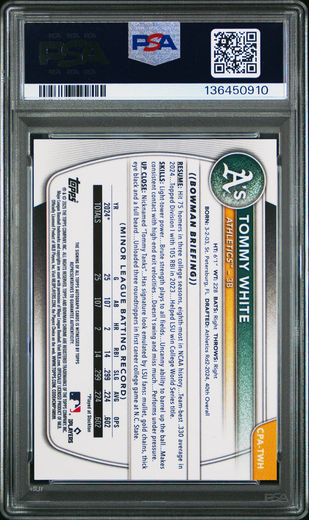 Tommy White - 2025 Bowman Chrome Prospect Autographs PSA 10
